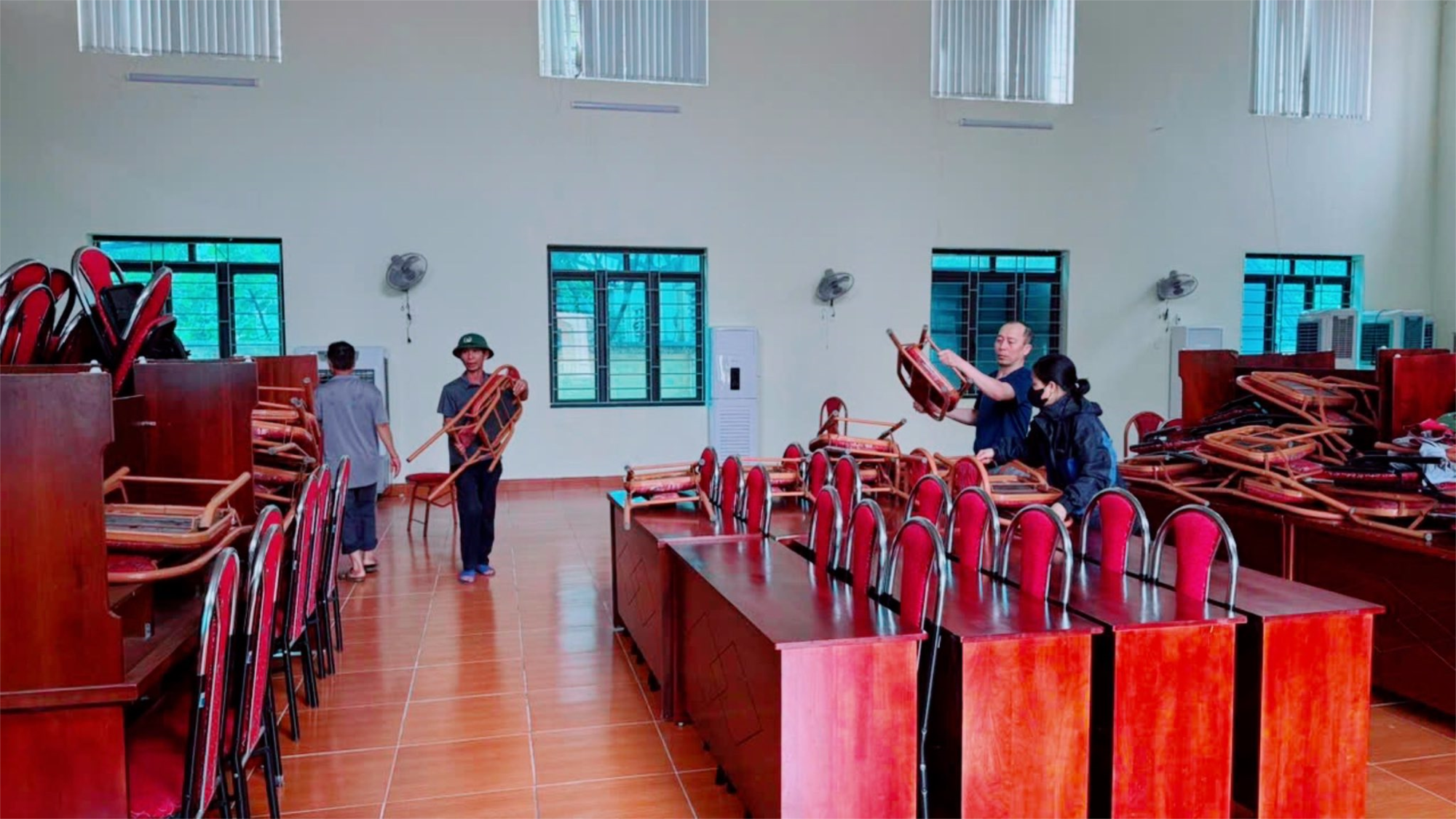 Bàn ghế được kê gọn, di chuyển lên vị trí an toàn.