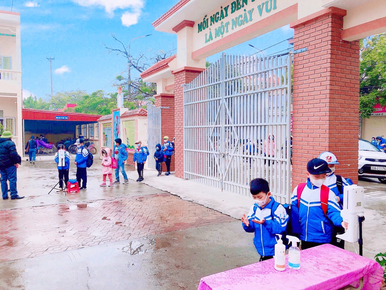 Các em tự động xếp hàng đo thân nhiệt và sát khuẩn tay khi tới trường.